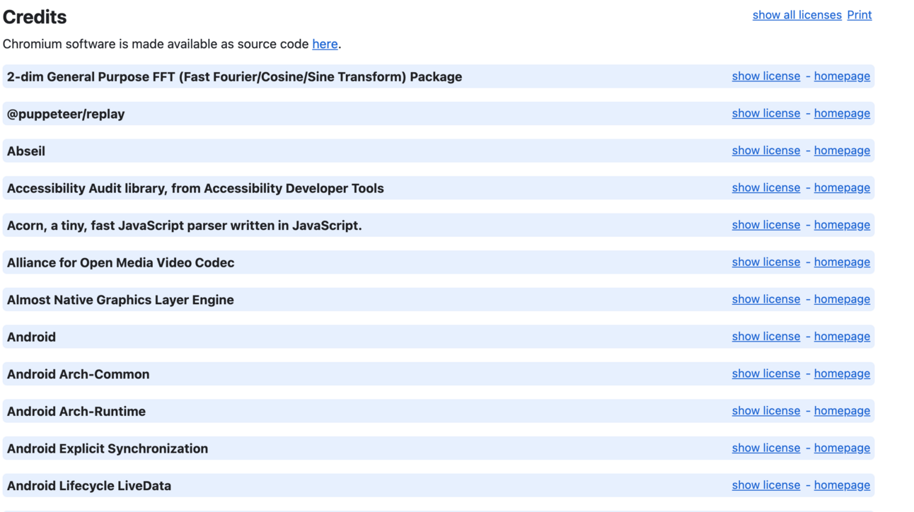Permissive Licenses: The least restrictive type of license. Users only have to include attribution of the open source code to the authors. Examples of how companies can provide this attribution is Google Chrome, which lists all of the open source components that were used to build the browser software and their associated licenses for end users to easily access. See chrome://credits/