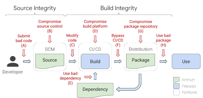 Google’s SLSA: A open source framework created by Google & other industry leaders that provides guidance on how software providers can harden their supply chain security. The scope of the frame work is focused on: